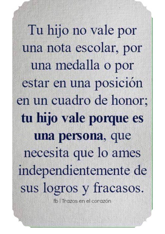 Tu hijo no vale por una nota escolar, por una medalla, o por estar en una posición en un cuadro de honor; tu hijo vale porque es una persona, que necesita que lo ames independientemente de sus logros y fracasos.